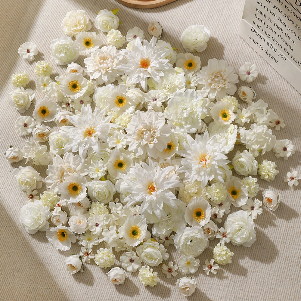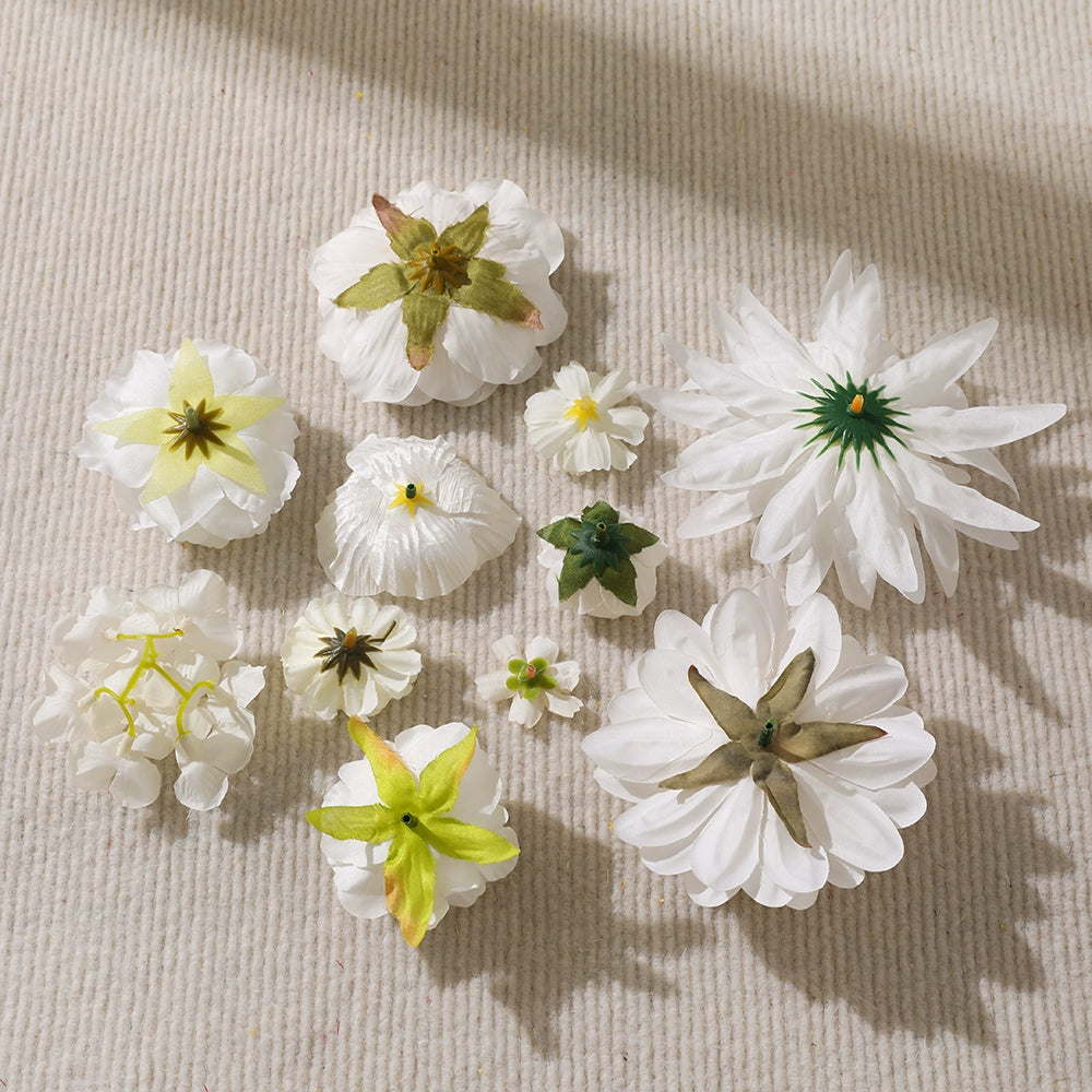 Create stunning white-themed DIY projects with our White Assorted Artificial Flower Mix. This collection features a variety of white blossoms in different sizes and textures, including large daisies, lush peonies, delicate roses, and petite filler blooms. Perfect for wedding decor, corsages, headpieces, wreaths, centerpieces, and handmade crafts. Soft, durable, and reusable, these fabric and silk flowers add elegance and timeless beauty to any design.