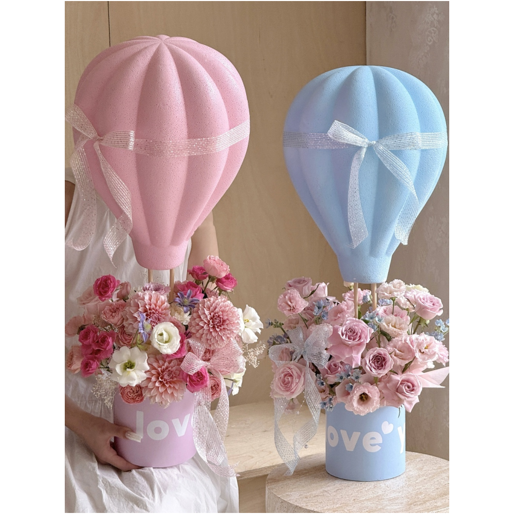 This whimsical hot-air-balloon bouquet box DIY kit, featuring a foam balloon, two slim wooden support sticks, and a round cardboard flower box. Simply place a piece of floral foam in the box, and you can start arranging your blooms. Once your floral arrangement is complete, insert the wooden sticks into the foam balloon and plant the balloon into the flower box for a sophisticated, romantic centerpiece. Ideal for birthdays, Valentine's Day, proposals, or anniversaries. Note: foam balloons may have creases or tiny flecks in transit—these are normal and do not affect the overall look.