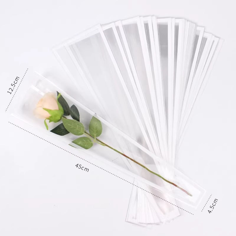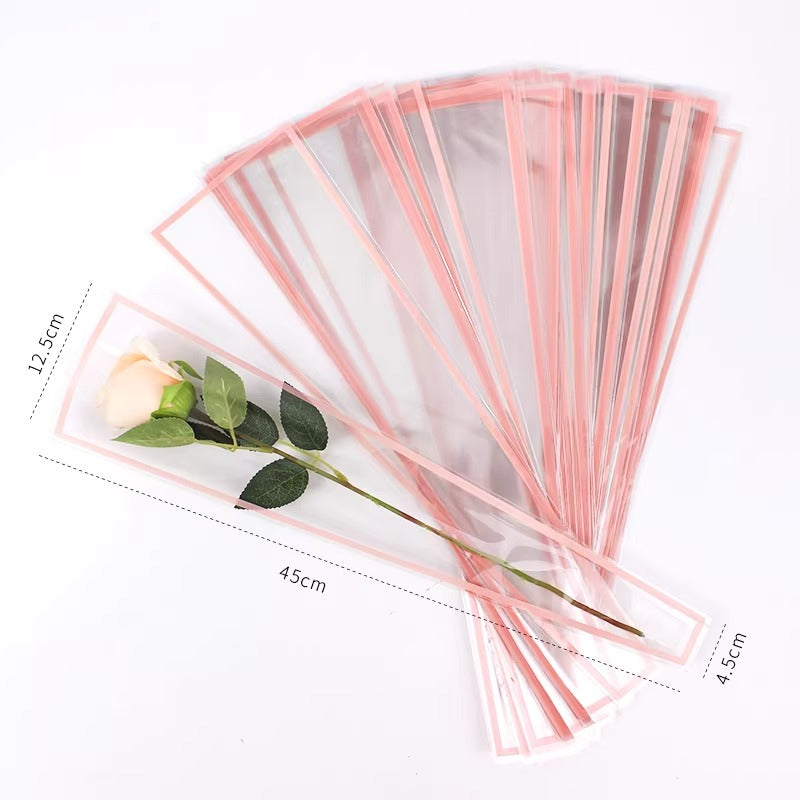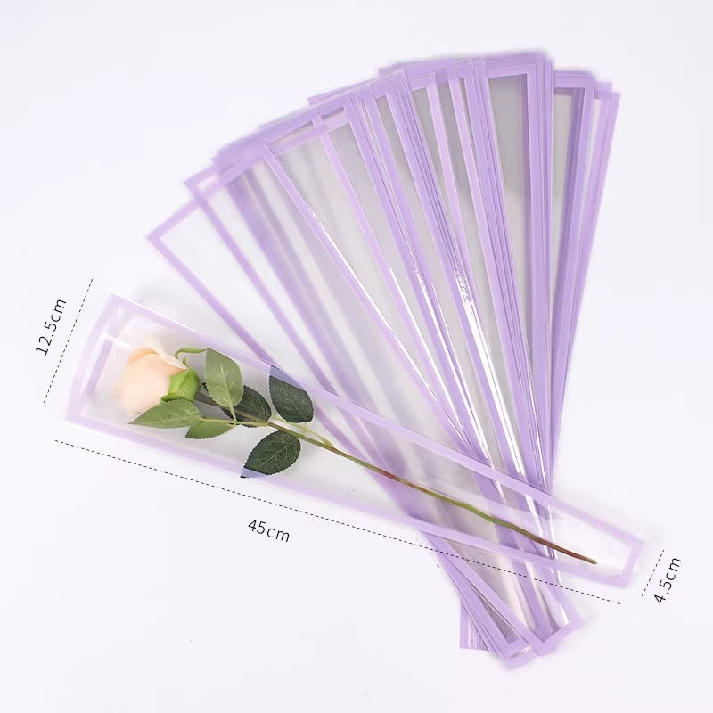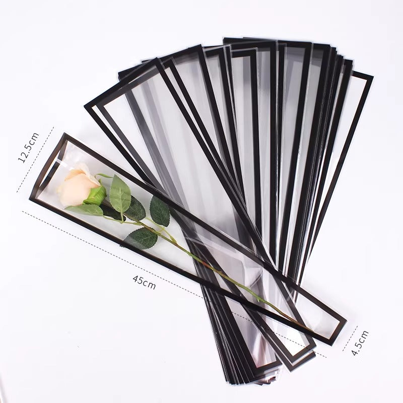 This transparent bag with a colorful frame is ideal for packaging fresh single stem roses. The see-through design showcases the beauty of the flowers, while the colorful border adds an elegant touch. Its stylish and practical design makes it a great choice for florists and gift shops aiming to present their flowers in a unique and attractive way.