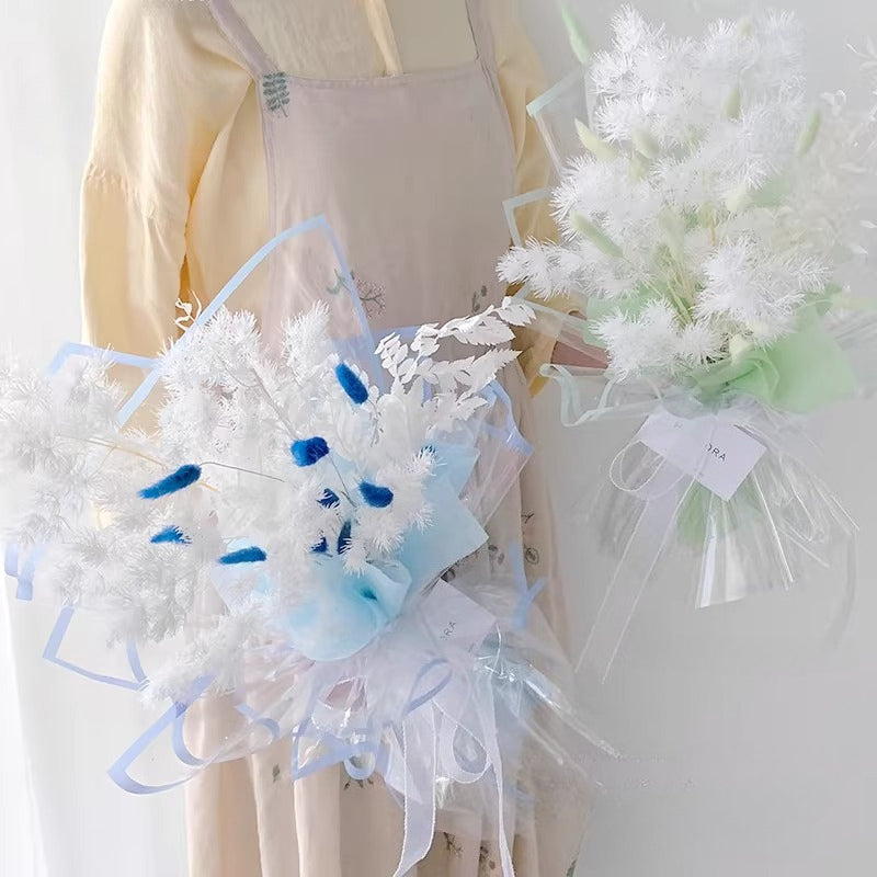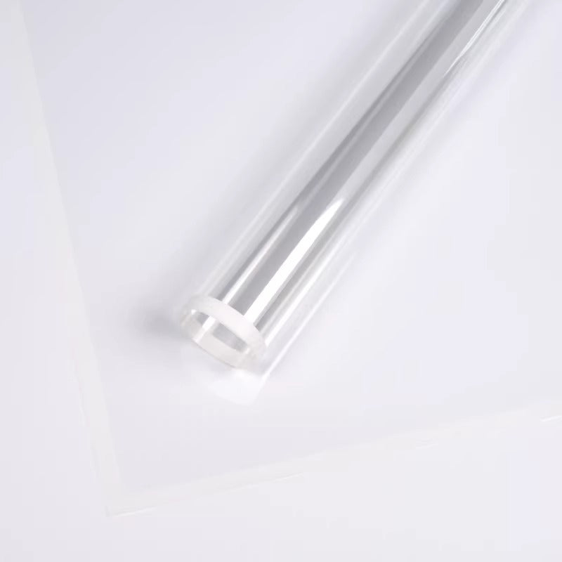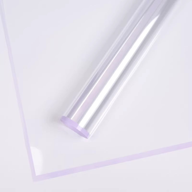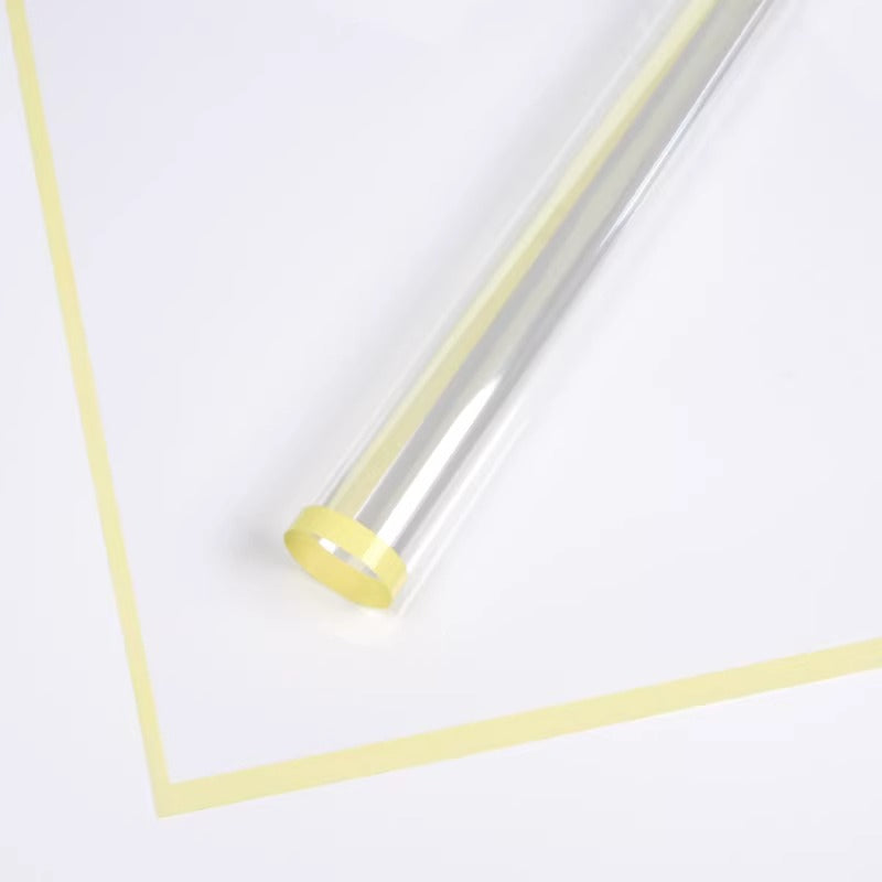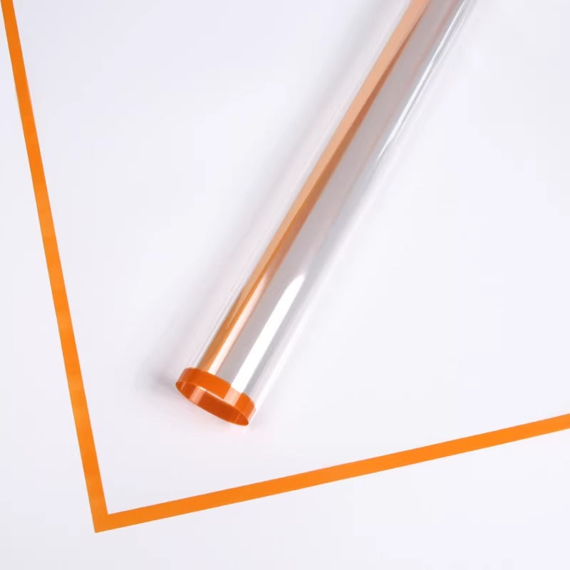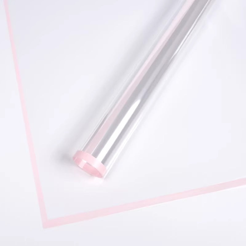 A modern, transparent cellophane wrap with a vibrant colored border that adds a touch of sophistication to any bouquet. Made from clear, durable plastic, it showcases the blooms while keeping stems secure and neatly arranged. The colored edge provides a subtle yet stylish accent, available in multiple hues to match any theme or occasion.