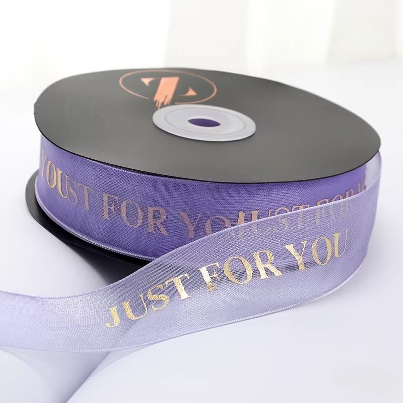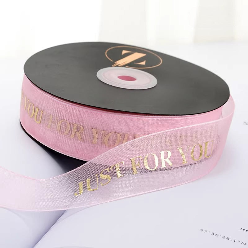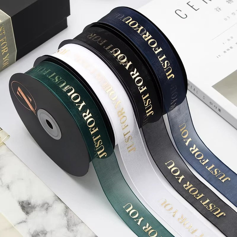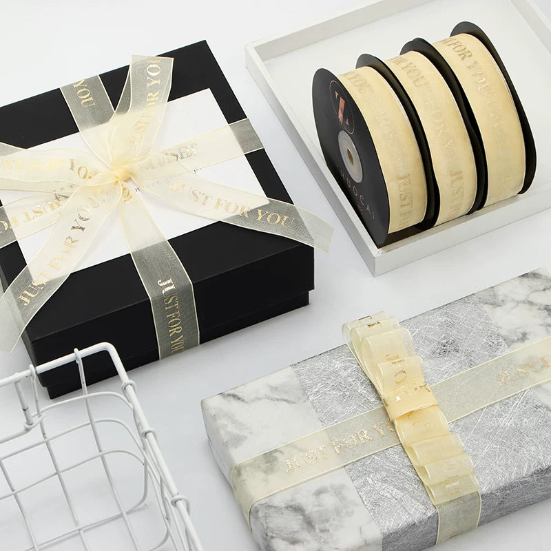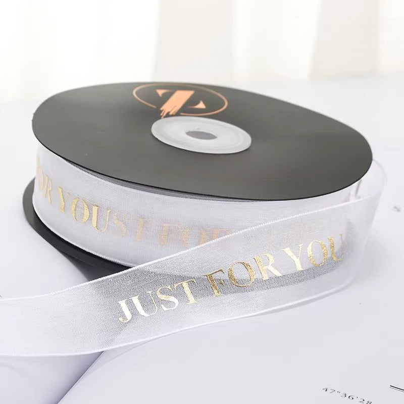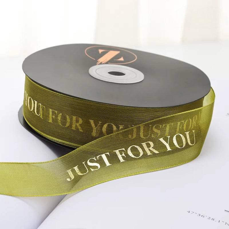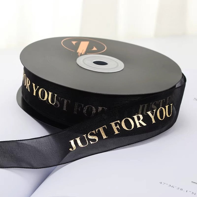 Elegant JUST FOR YOU ribbon blends premium organza with a radiant metallic finish. Lightweight, silky-smooth texture adds a refined touch to any gift, bouquet, or holiday decor. Its minimalist yet sophisticated design elevates wrapping with a subtle, high-end glow.