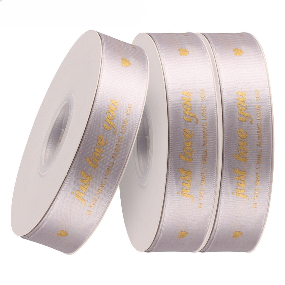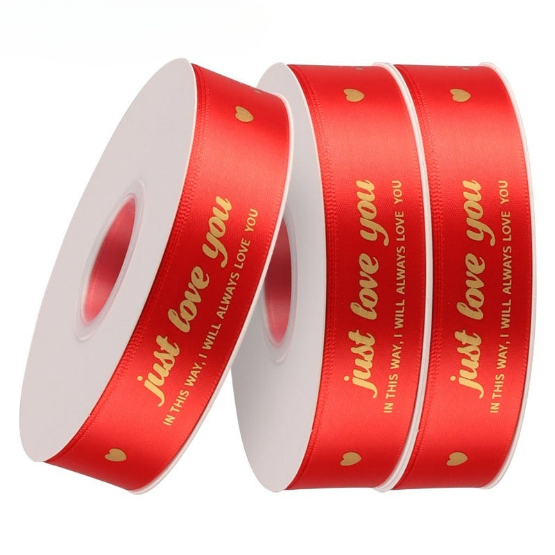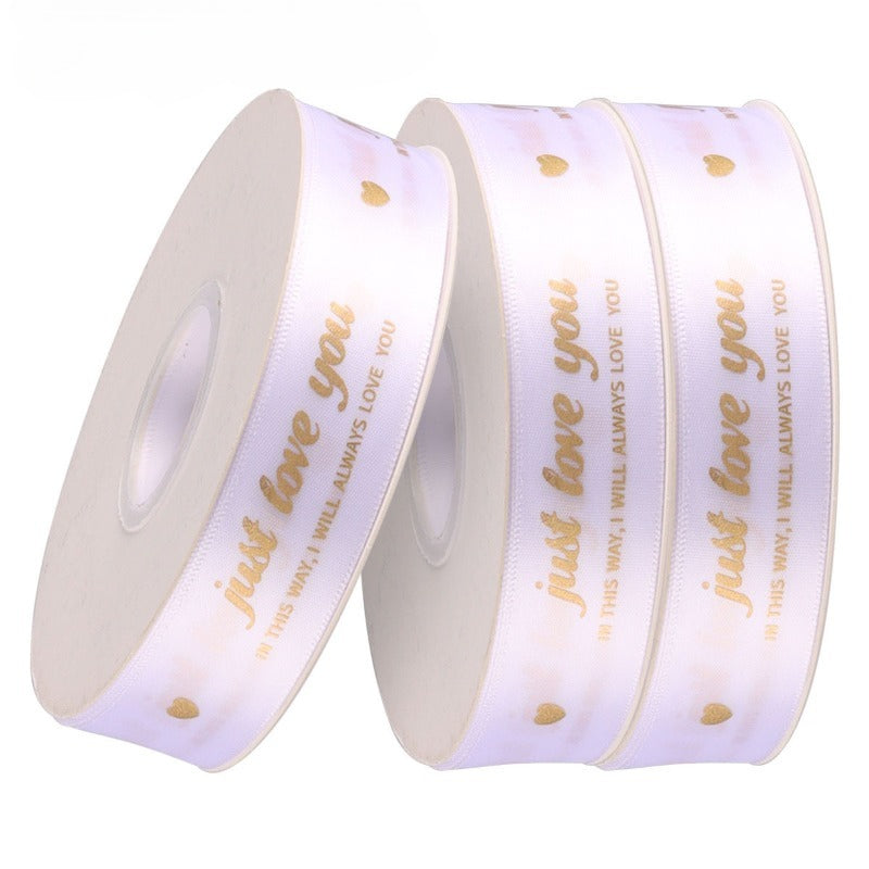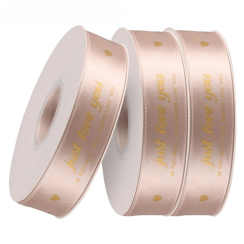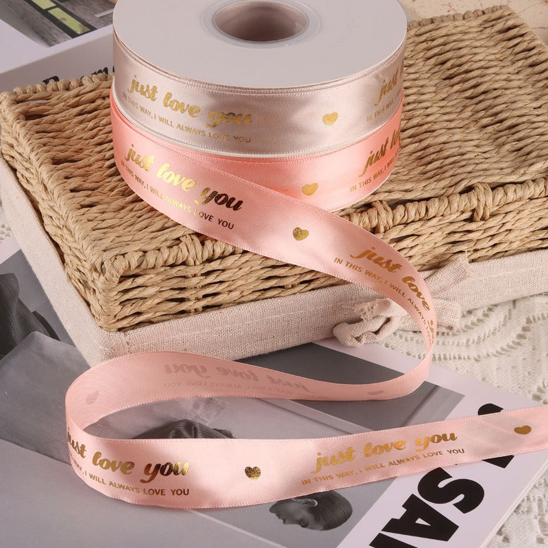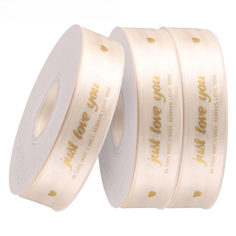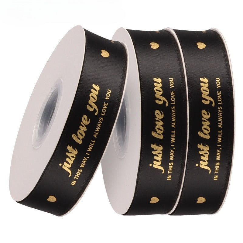 Elegant satin ribbon features elegant gold-foil prints of "just love you"and delicate gold hearts. Available in multitable color range—black, ivory, blush, rose, and champagne—each ribbon is smooth to the touch with a subtle sheen that elevates any gift. Perfect for Valentine's Day bouquets and premium gift wrapping, the ribbons add a luxurious, heartfelt touch. Use them to convey affection with a timeless, sophisticated charm.