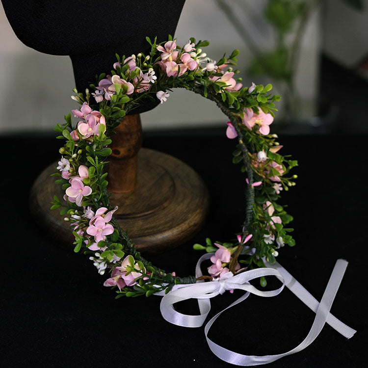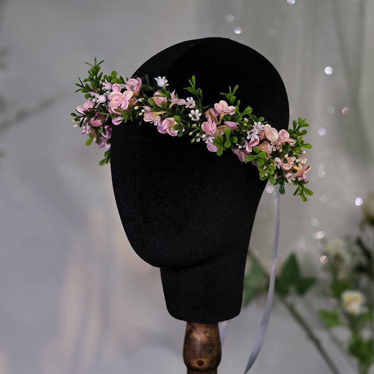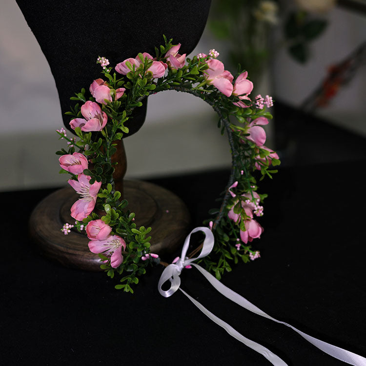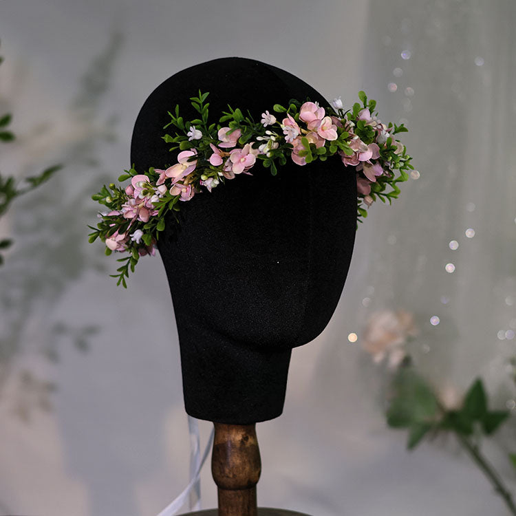 This charming pink floral headband features delicate artificial blossoms and fresh greenery, perfect for a fairy-tale or bohemian bride. Its simple yet elegant design makes it versatile for outdoor shoots, destination weddings, or casual bridal looks. Crafted for a natural, fresh aesthetic, it adds a soft, romantic touch to any wedding or photoshoot ensemble, blending effortlessly with various styles.