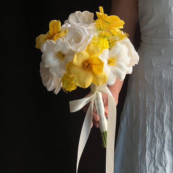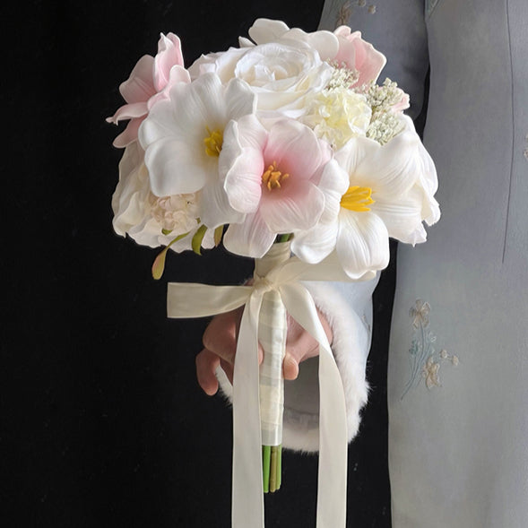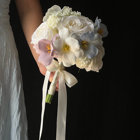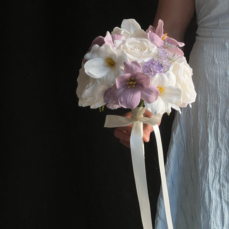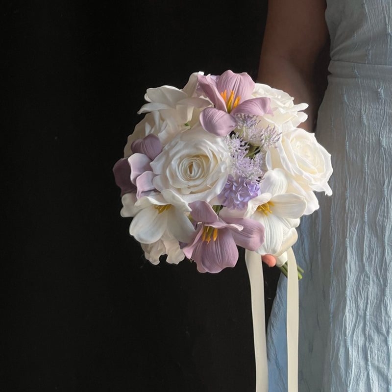 This luxurious faux floral wedding bouquet showcases a harmonious blend of elegant white roses and delicate purple orchids, accented by subtle filler flowers. Designed for brides seeking a timeless yet sophisticated look, it offers a durable and beautiful alternative to fresh flowers. Perfect for wedding decor, this bouquet adds a touch of grace and class to your special day.