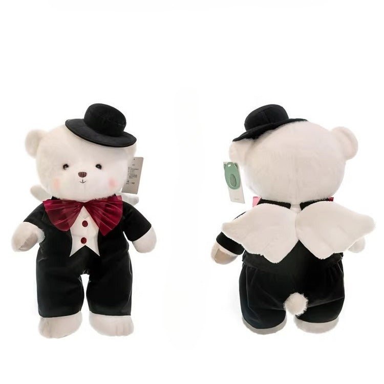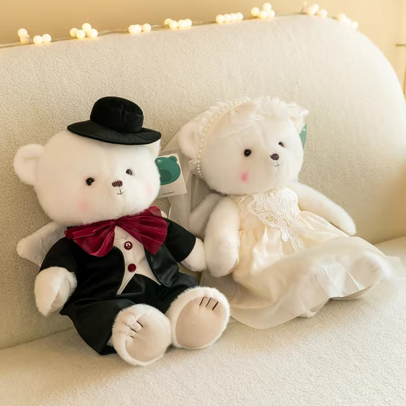 Celebrate your special day with this charming pair of 30cm Wedding Teddy Bear Plush Toys. The groom bear dons a classic black velvet tuxedo, complete with a glossy top hat and a rich burgundy bow tie, while the bride bear is elegantly dressed in a satin wedding gown with delicate lace detailing, finished with a soft tulle veil and pearl-adorned headpiece.