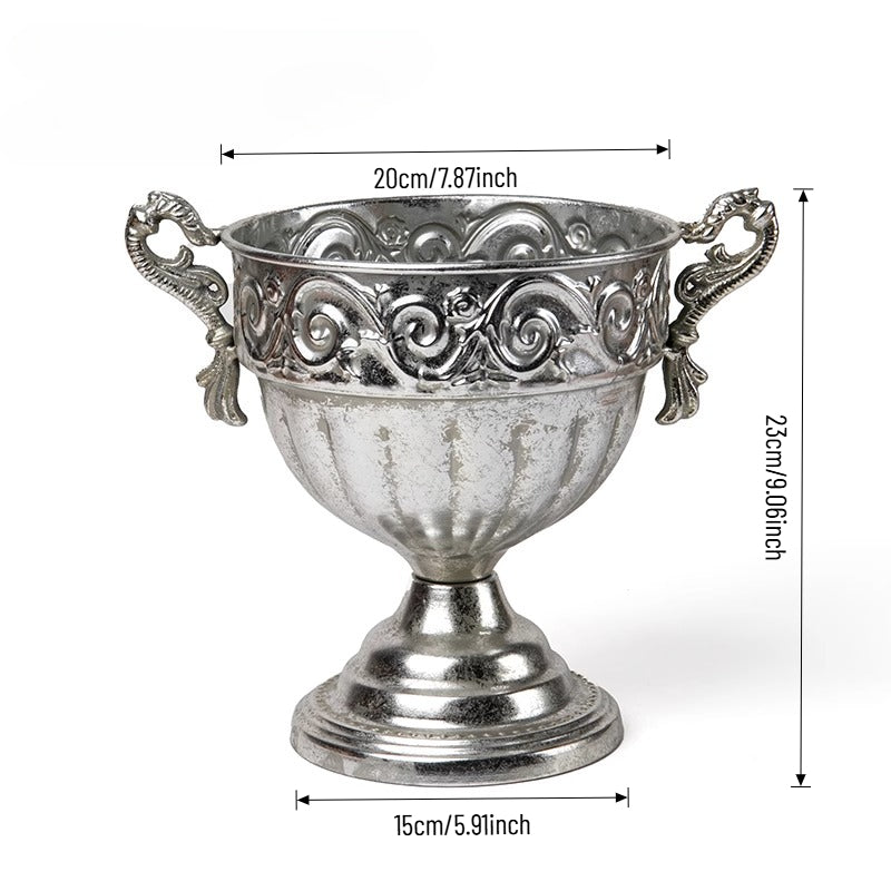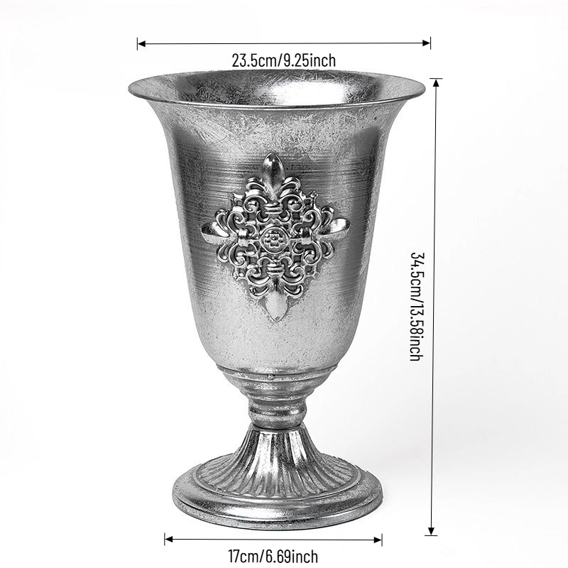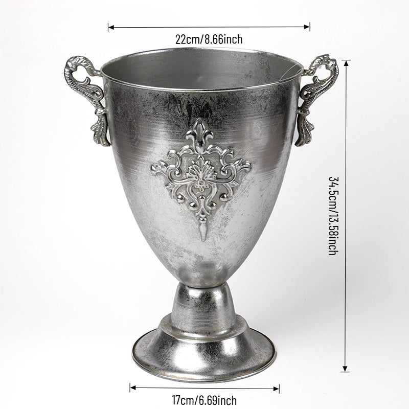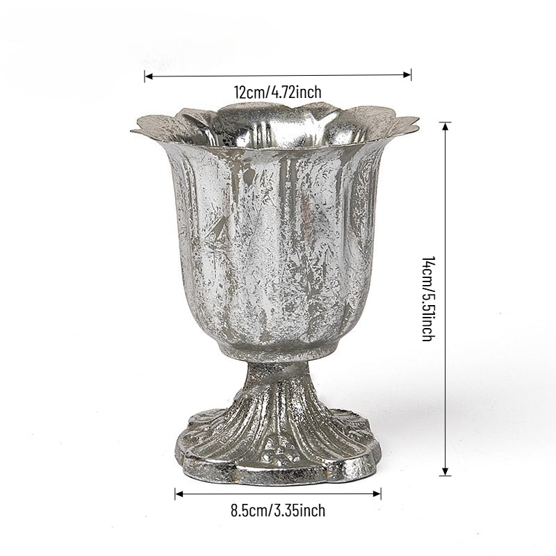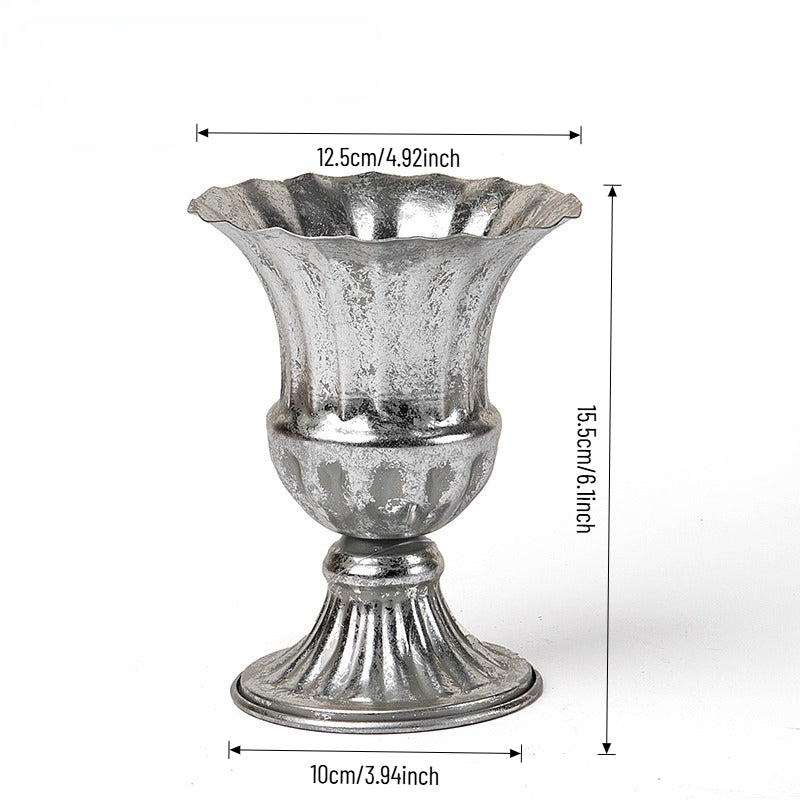 Elevate events with our vintage metal vase — a luxurious, lightly antiqued centerpiece that catches warm light with ornate engravings and graceful handles. Perfect as a standalone centerpiece for weddings, banquets, or chic home decor, it enhances both fresh and dried florals with tactile metallic charm and lasting durability. A refined essential for florists, designers, and party pros seeking versatile elegance.