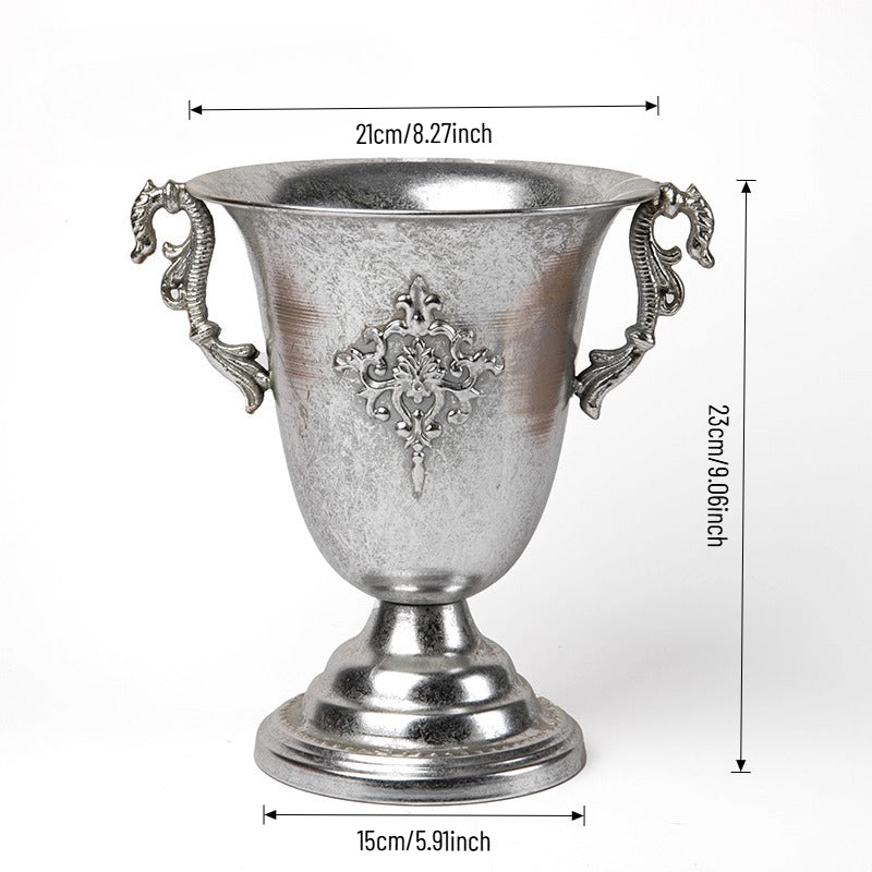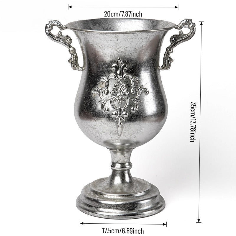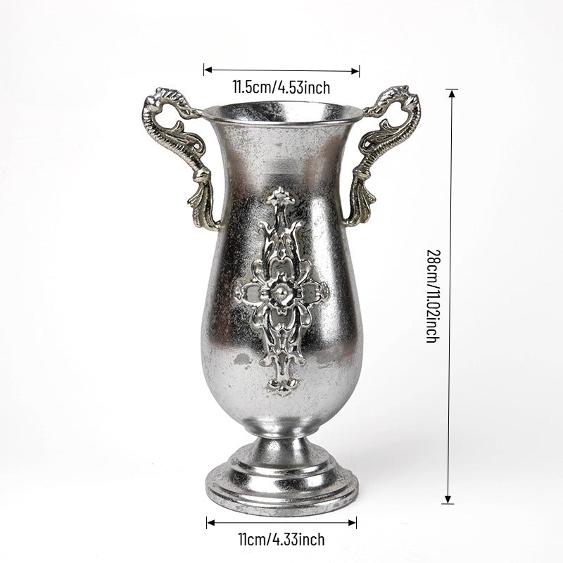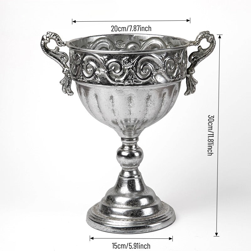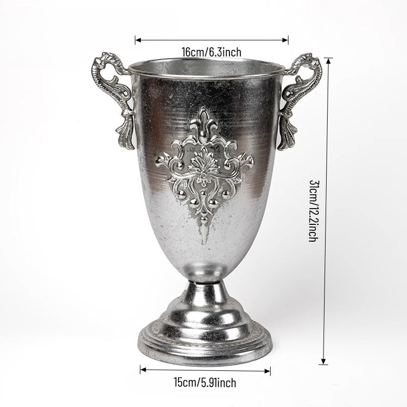Elevate events with our vintage metal vase — a luxurious, lightly antiqued centerpiece that catches warm light with ornate engravings and graceful handles. Perfect as a standalone centerpiece for weddings, banquets, or chic home decor, it enhances both fresh and dried florals with tactile metallic charm and lasting durability. A refined essential for florists, designers, and party pros seeking versatile elegance.