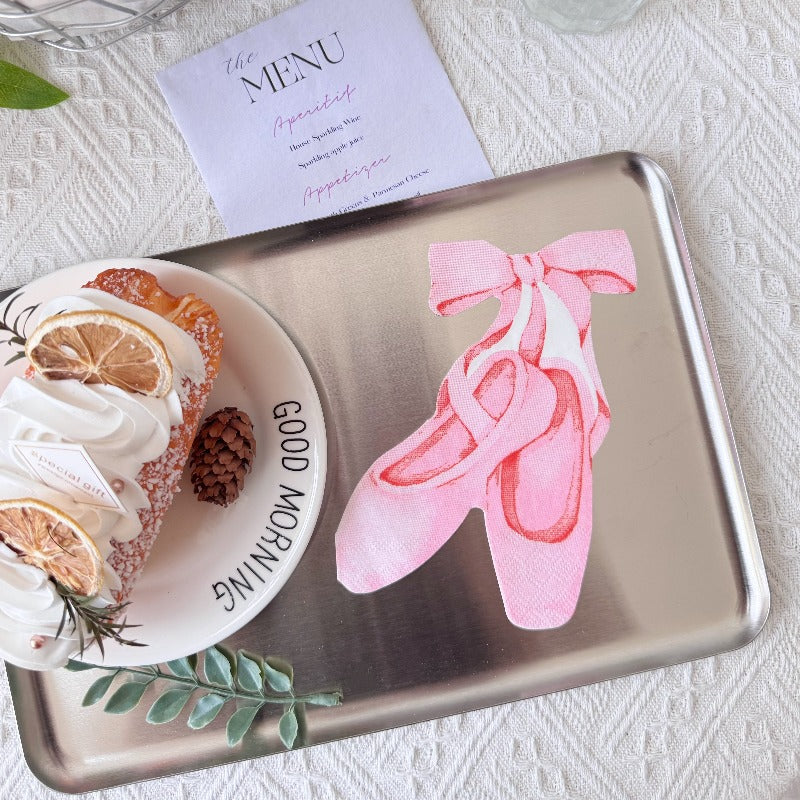 Pink ballet slipper napkins are two-ply, disposable napkins featuring a delicate ballet shoe design. Each sheet measures13 x 16 cm, crafted from natural wood pulp with food-grade ink. Ideal for birthdays, parties, and elegant gatherings, these napkins add a whimsical, graceful touch to table settings.