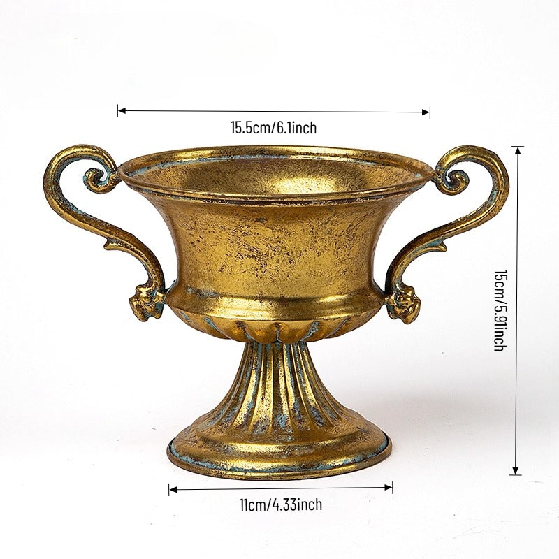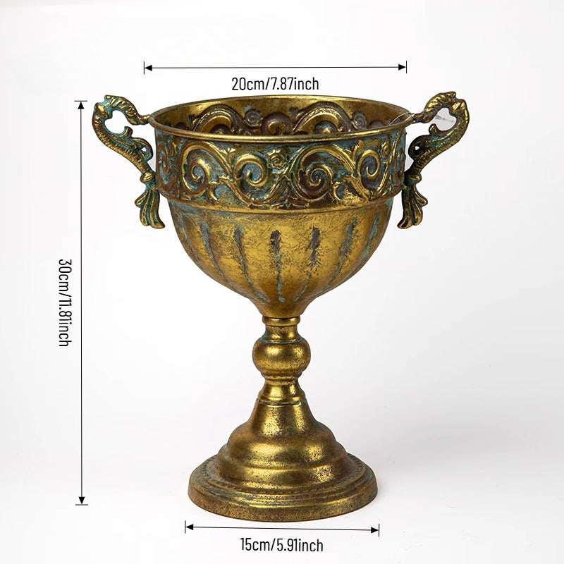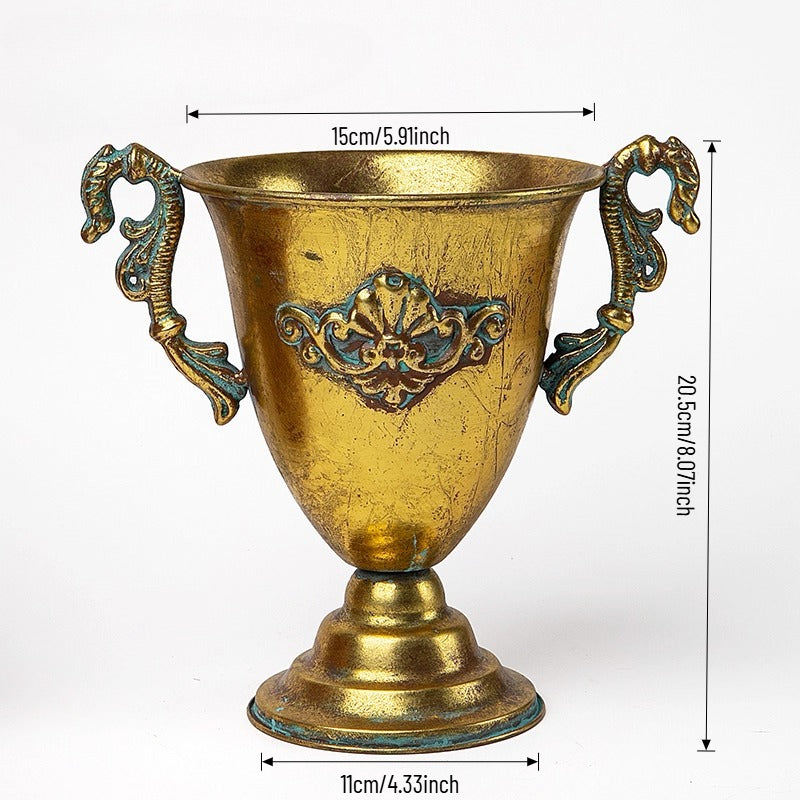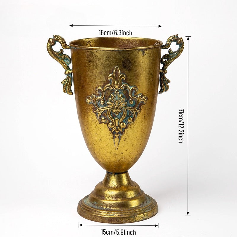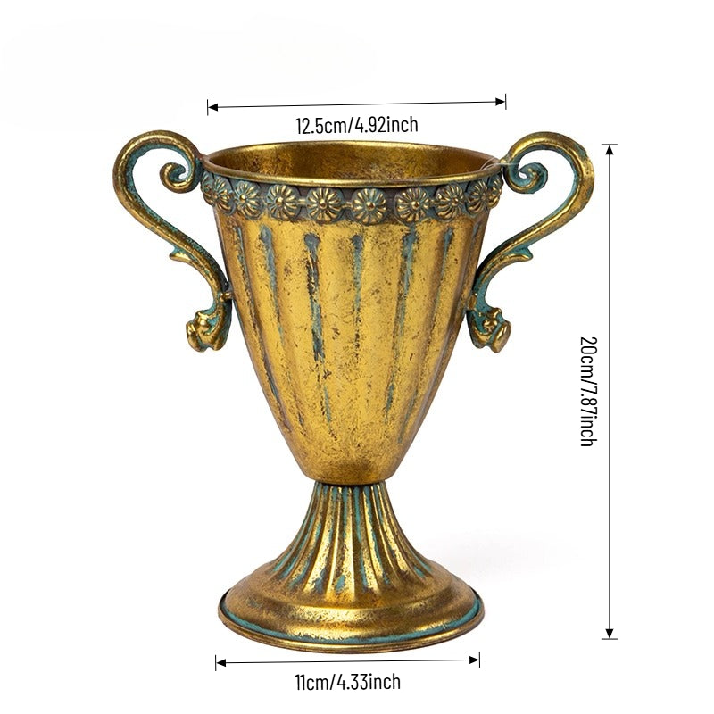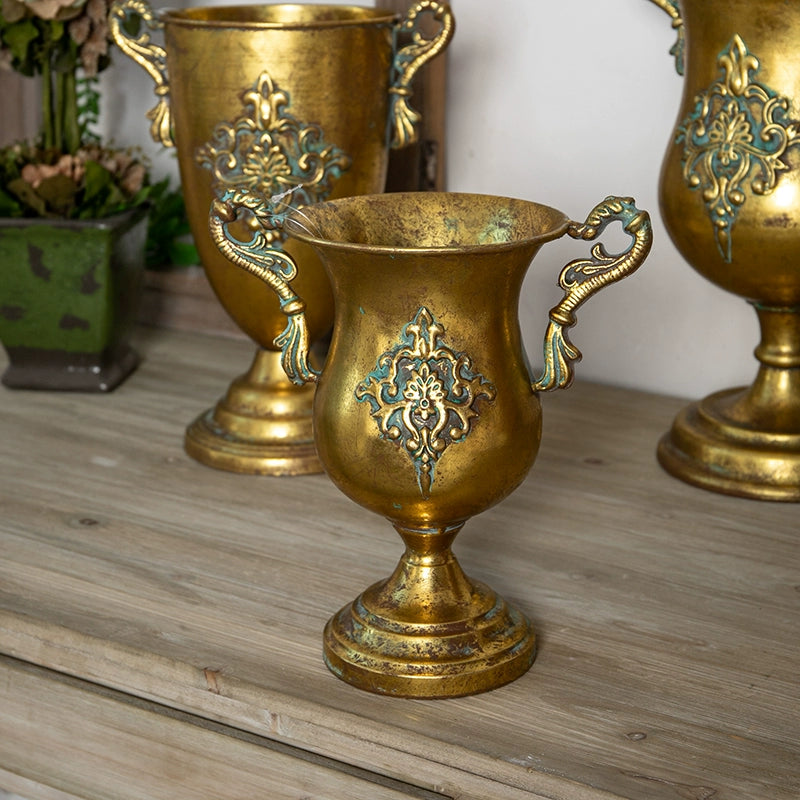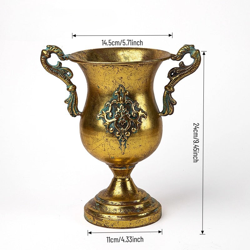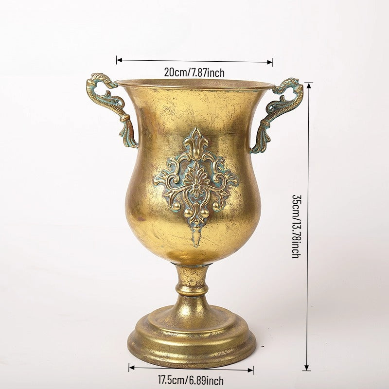 Elevate any occasion with our vintage gold metal vase—a luxurious centerpiece with a softly antiqued finish. Its ornate engravings and elegant handles catch the light, delivering warm, tactile charm. Whether used solo for weddings, banquets, or chic home decor, it complements both fresh and dried florals with lasting durability. A refined essential for florists, designers, and event professionals seeking versatile, timeless elegance.