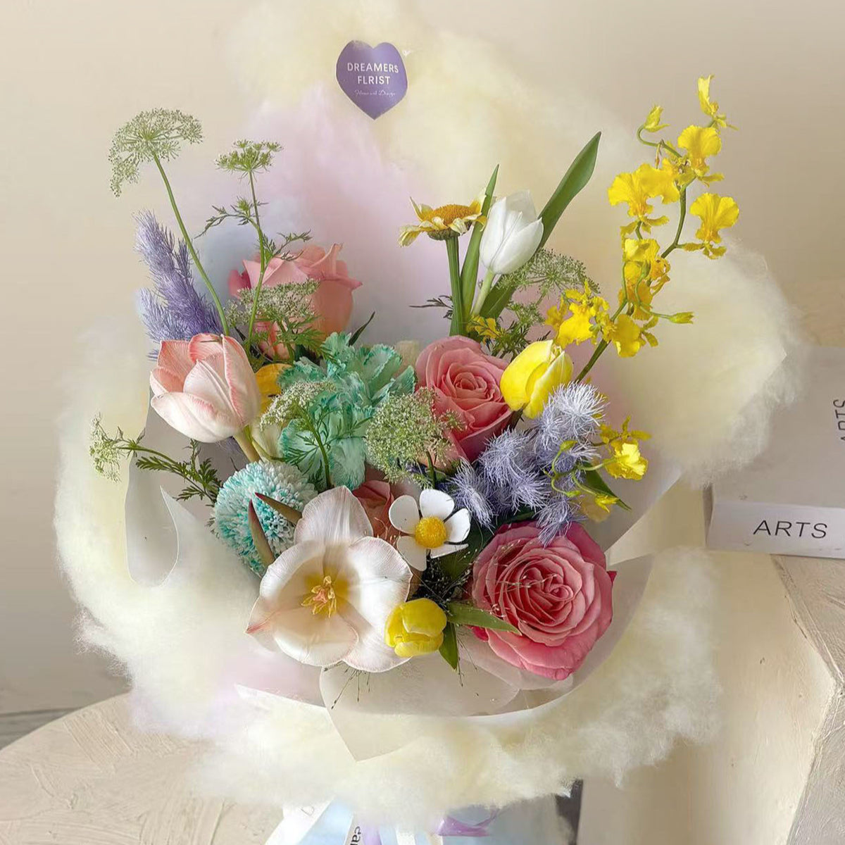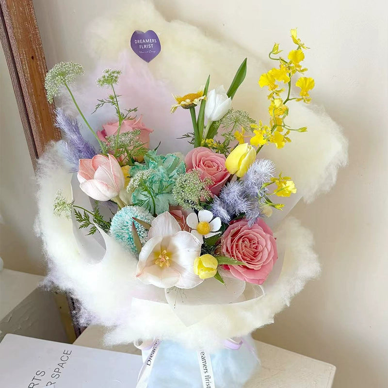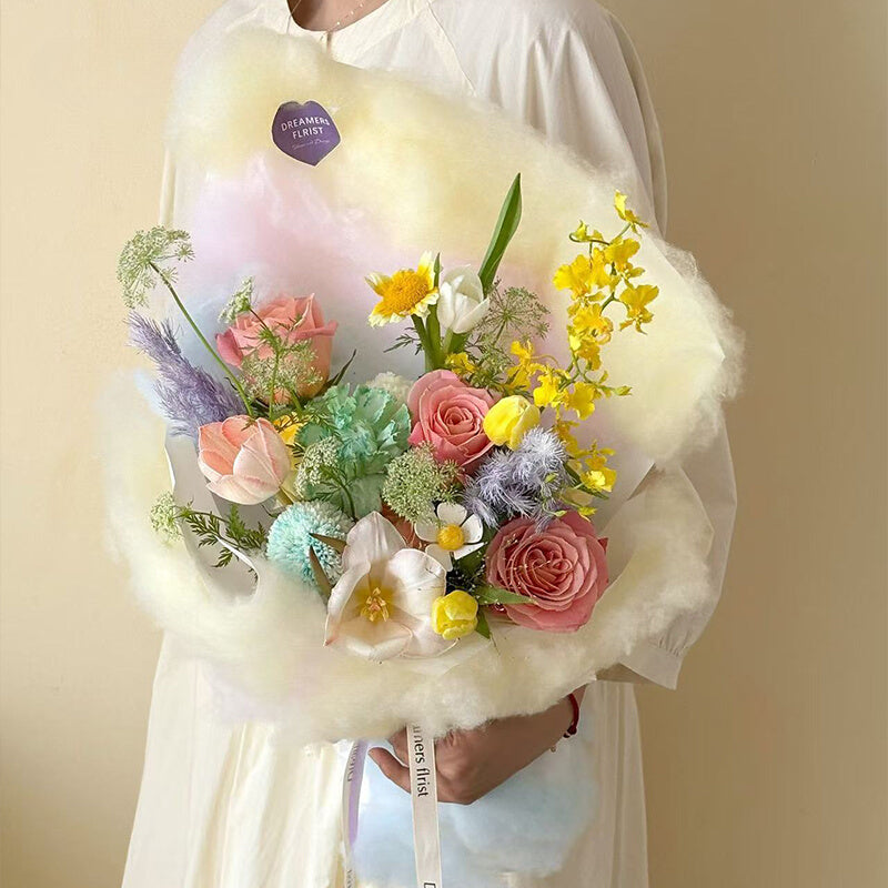 Introducing colored cloud cotton– a dreamy floral wrapping material that transforms ordinary bouquets into ethereal masterpieces! Made from soft, lightweight cotton, this innovative packaging comes in multiple pastel shades to enhance any floral arrangement. Its fluffy, cloud-like texture creates an airy, weightless effect, making flowers appear to float effortlessly. Perfect for holidays, romantic gifts, or artistic displays, it adds a whimsical touch while keeping blooms secure. The natural cotton material is gentle on petals and eco-friendly. Elevate your floristry with this versatile, Instagram-worthy wrapping—ideal for florists and DIY lovers who crave creativity and elegance!
