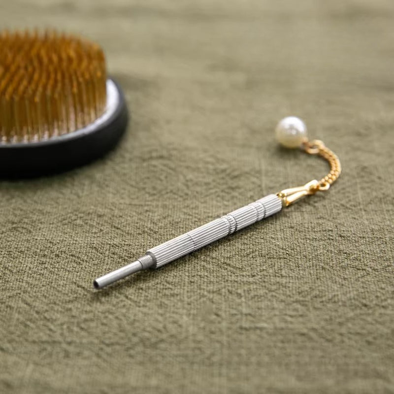 Revive and preserve your kenzan with our precision needle correction tool. This compact, adaptable gadget realigns bent metal needles from use, restoring the flower frog’s even surface and extending its lifespan. Beyond straightening, the integrated needle head cleans residual debris trapped inside the needles, ensuring smooth performance for years of ikebana and craft work. A beaded pearl charm adds a touch of elegance to your toolkit.
