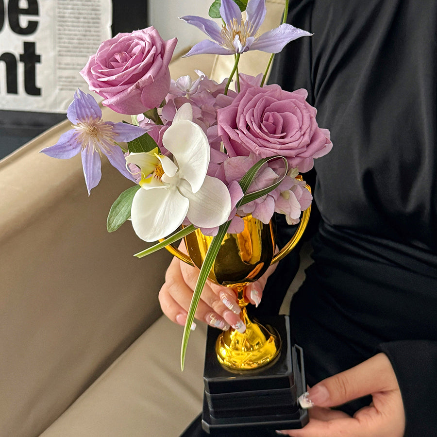 This innovative gold trophy-shaped flower holder is perfect for celebrating special moments like graduations or commemorative events. Simply add a small piece of floral foam inside to create stunning floral arrangements. Its elegant design makes it an ideal gift or decoration for unforgettable occasions, combining creativity with elegance.