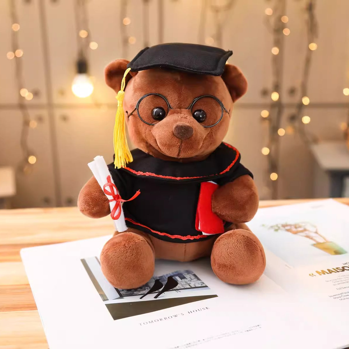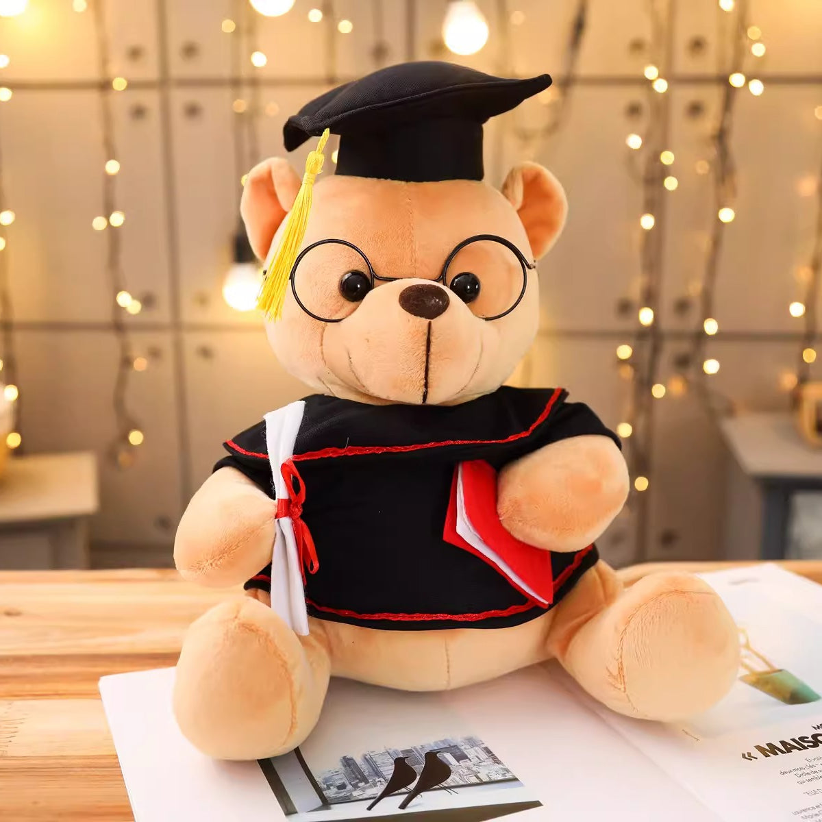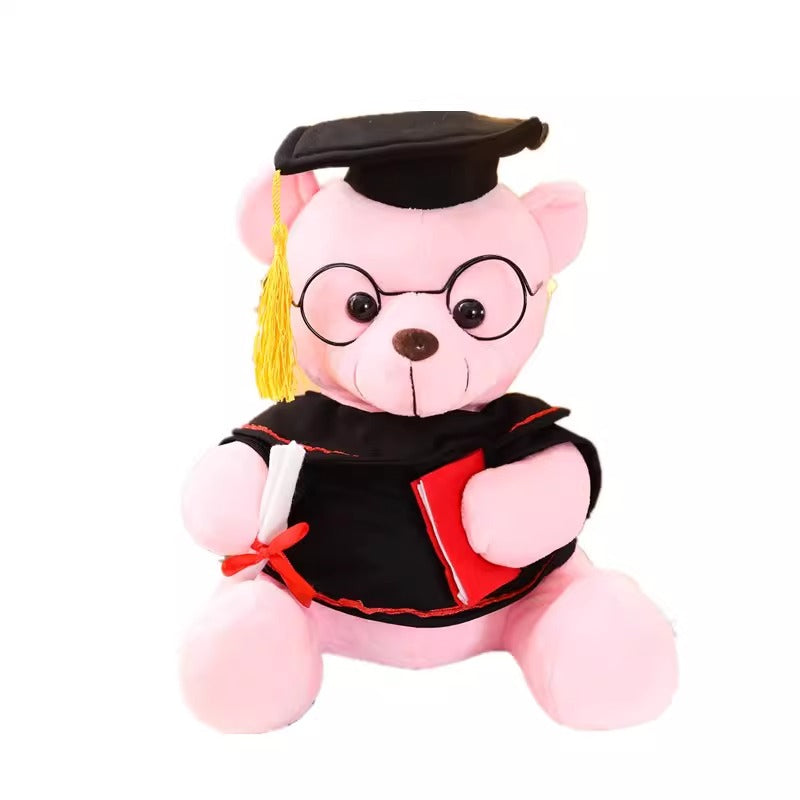 Celebrate your academic milestone with this adorable Pink Graduation Bear Plush Toy! Dressed in a classic black graduation gown with red trim, complete with a tasseled doctorate cap, this cuddly teddy bear wears round black glasses for a scholarly look. It holds a diploma and a red-accented book, making it the perfect symbol of achievement. Soft, huggable, and crafted with high-quality plush fabric, this 23cm companion is ideal for graduation gifts, dorm decor, or a heartfelt keepsake for students of all ages.