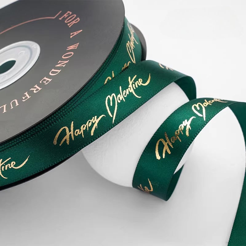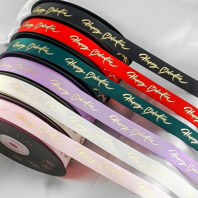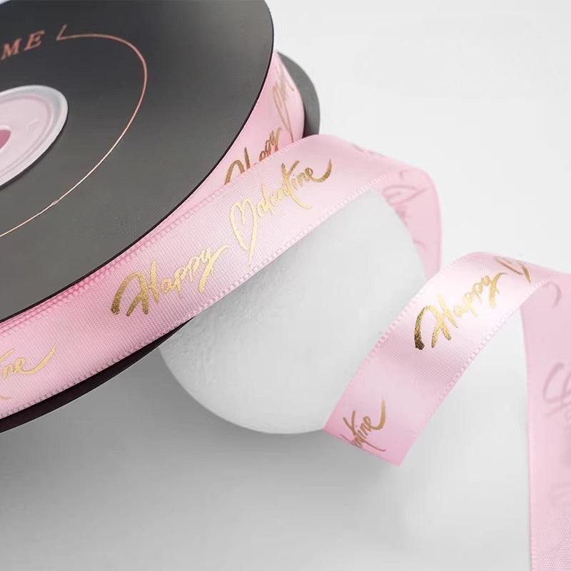 Elevate your Valentine's gifting with the Happy Valentine Satin Ribbon. This premium satin ribbon features elegant gold "Happy Valentine" lettering that shimmers with a luxurious finish. Perfect for wrapping bouquets, embellishing gift boxes, or adding a romantic touch to favors, it blends luxury, durability, and festive charm. A refined accent for Valentine's Day, anniversaries, and any romantic celebration.