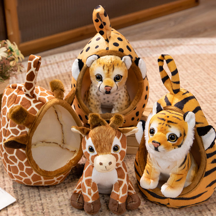 These adorable plush animal baby toys come with cozy nests, featuring lifelike designs of tiger, leopard, giraffe, and lion. Made from soft, high-quality fabric with detailed features, they are perfect as charming gifts or decorative accents for kids' rooms. These plush creatures offer cuddly comfort and playful appeal in a wildlife-inspired set.