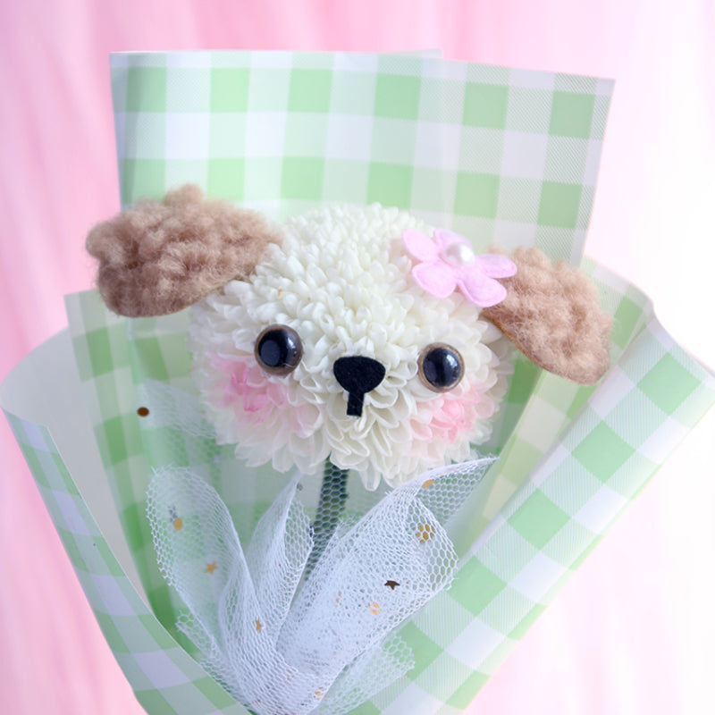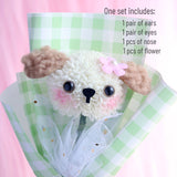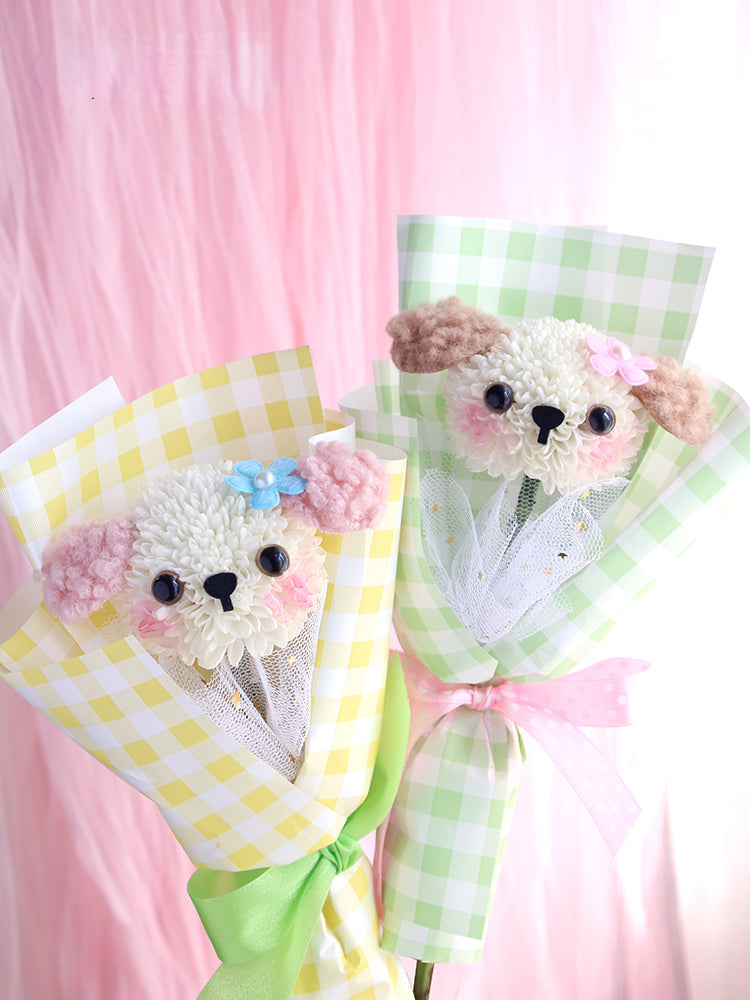 - With this material kit, you can make a cute puppy flower bouquet easily.