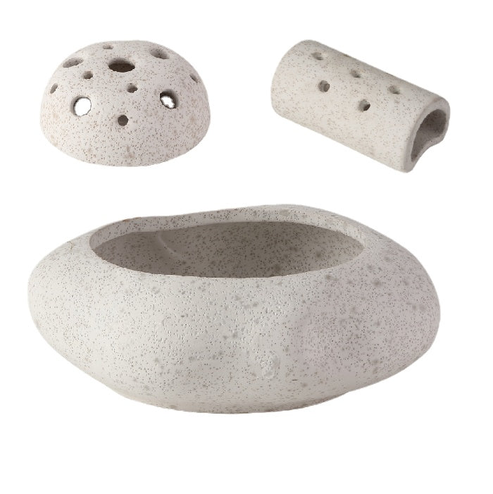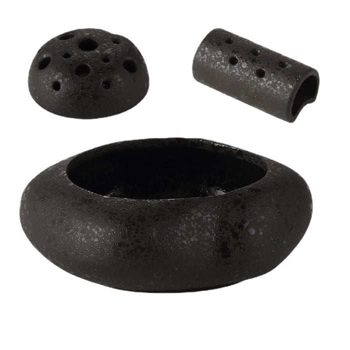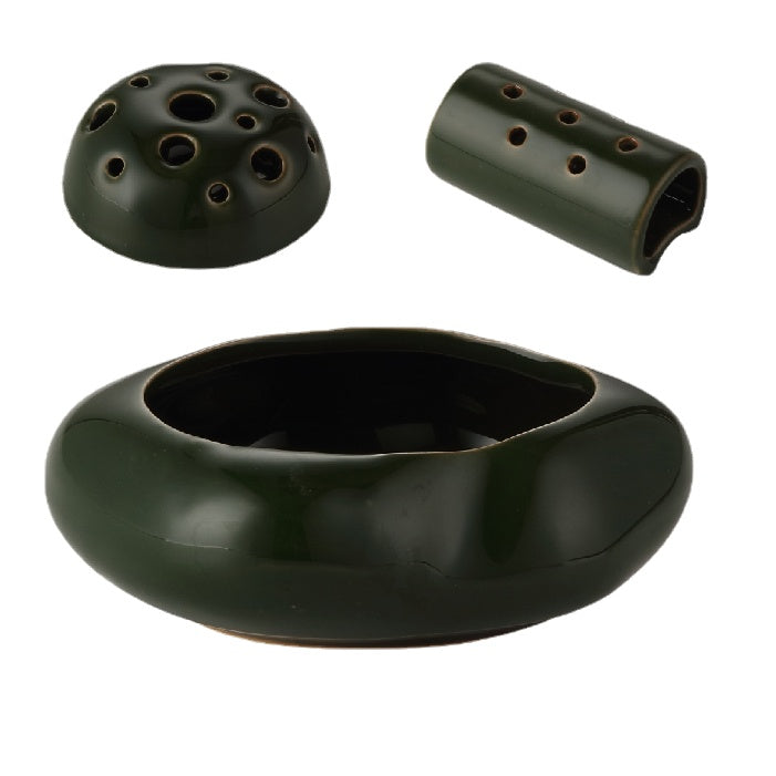 Transform your floral arrangements into works of art with our Japanese Ikebana ceramic bowl and flower frog kit. This set includes a beautiful ceramic bowl which has a rough texture that gives it a very tactile quality, and two ceramic flower frogs - one round and one oblong - both with strategically placed holes to hold your flowers in place and create stunning arrangements. Use this Ikebana vase with frog set to showcase your favorite blooms and bring a touch of Zen and elegance to any room.