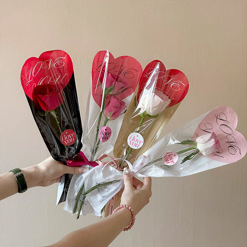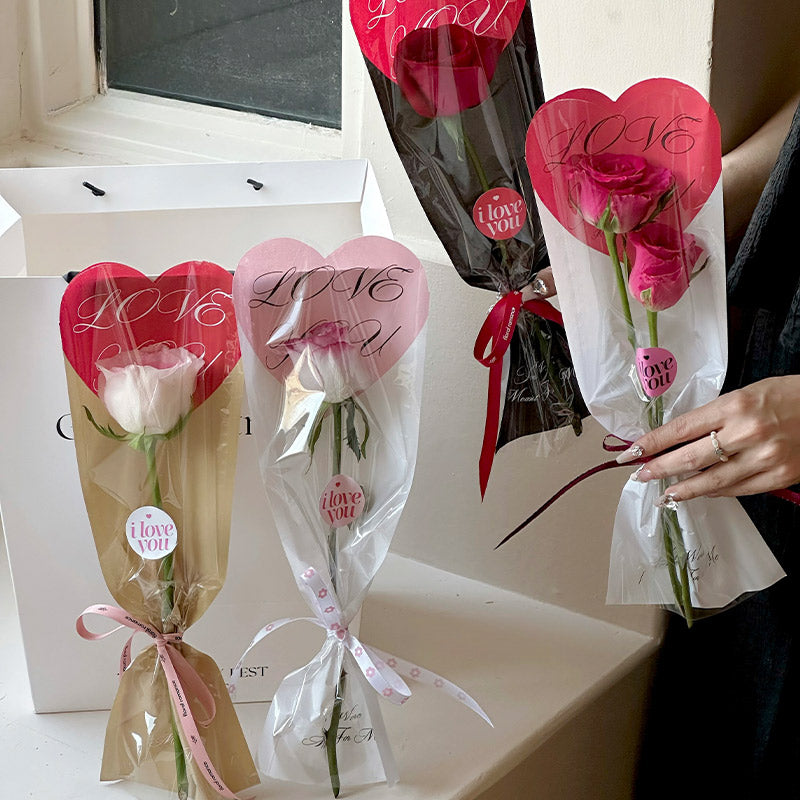 Featuring a transparent front made of plastic, and a sturdy back made of Kraft paper, this single rose packaging bag offers both elegance and durability. The back of the bag is adorned with a large, eye-catching love heart symbol, adding a touch of romance to your gift. Combine your imagination with coordinating ribbons and stickers to personalize the packaging further, turning a simple rose into a heartfelt present for your loved one.
