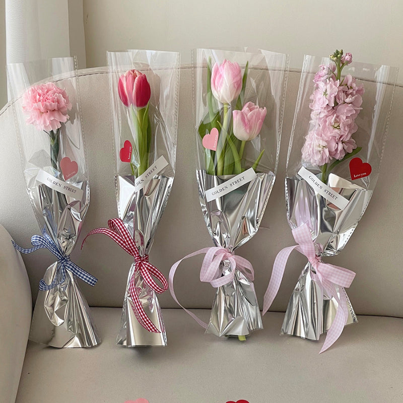 Our flower sleeves feature a half mirror silver print design that beautifully complements any bouquet, making them ideal for any occasion. The clear section showcases the flowers' natural beauty. Available in two sizes, the small bags are perfect for single stem bouquets, while the large ones suit larger displays.